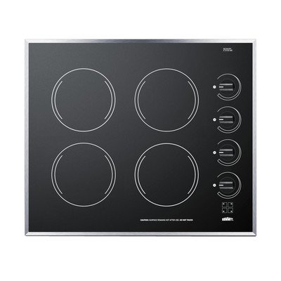 CR424BL Color: Black Features: -Indicator lights: Each burner includes an indicator light to show when the unit is on. -304 Grade stainless steel trim adds durable support with professional style. -Easy cleanup, and sleek kitchen style. -Push-to-turn Knobs: Controls require a gentle push to help prevent cooking accidents. -Canadian Electrical Safety: ULC. -US Electrical Safety: UL. Primary Material: -Ceramic. Cooktop Surface Style: -Smoothtop. Voltage: -240 Volts. Country of Manufacture: -United States. Number of Burners: -4. Dual Size Burner: -Yes. Generic Specifications: -Four 1200W burners made by E.G.O. in Germany. -Voltage/Frequency: 240 V AC/60 Hz. Dimensions: -24” Width is ideally sized for many hard-to-fill cutouts. -Cutout dimensions: 2.5” H x 22.13” W x 18.63” D. -Countertop Cutout dimensions: 22.13” W x 18.63” D. -Individual burner diameter: 6.5″. Overall Height – Top to Bottom: -3″. Overall Width – Side to Side: -24″. Overall Depth – Front to Back: -20.5″. Overall Product Weight: -40 lbs.4 Radiant E.G.O. Elements